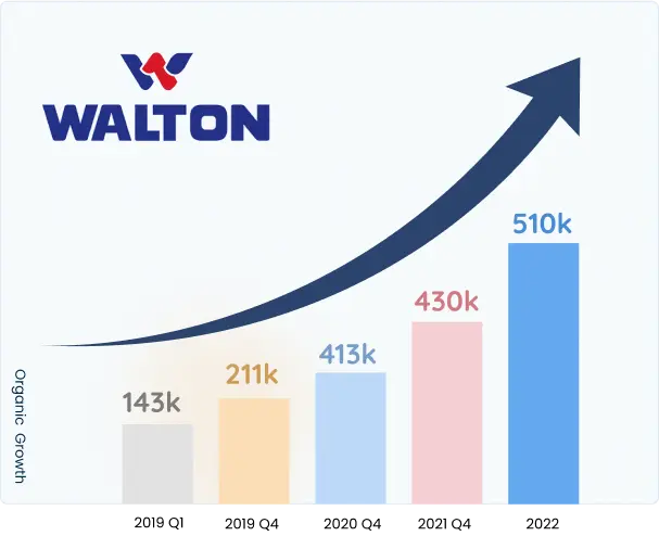 One of our biggest success stories is how Khan IT was able to boost the business growth of WALTON by 104% in a short time. With effective On-page and technical SEO tactics, content optimization, and keyword ranking, we could boost their traffic and increase their organic keyword count by 250%.